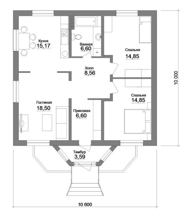 Общая площадь: 88,78 м2, одноэтажный, 2 спальни, материал строительства: блоки.