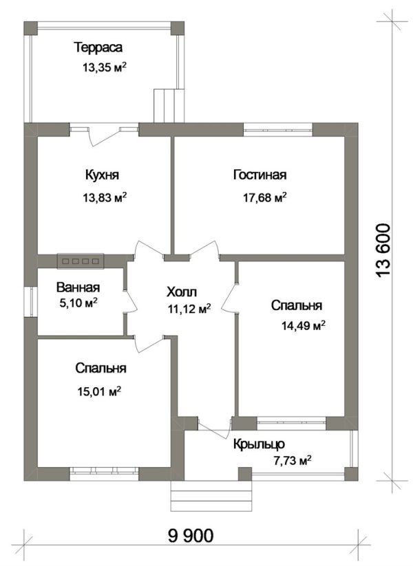 Общая площадь: 98,31 м2, одноэтажный, 2 спальни, материал строительства: кирпич, дополнения: терраса.