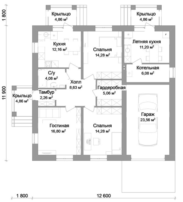 Общая площадь: 132,96 м2, одноэтажный, 2 спальни, материал строительства: кирпич, дополнения: гараж.