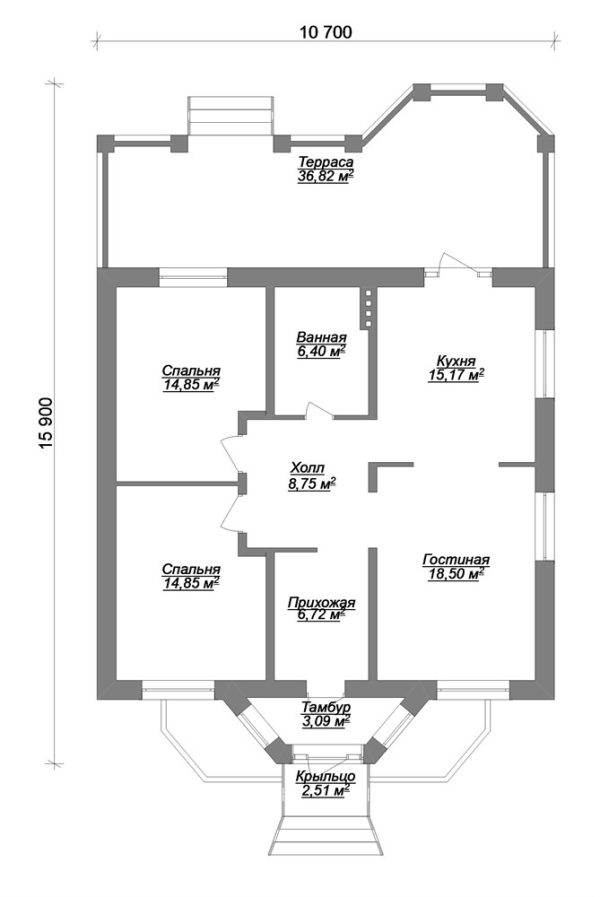 Общая площадь: 127,67 м2, одноэтажный, 2 спальни, материал строительства: блоки, дополнения: терраса.