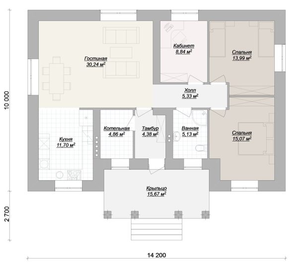 Общая площадь: 115,22 м2, одноэтажный, 2 спальни, материал строительства: блоки, дополнения: терраса.