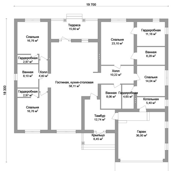 Общая площадь: 256,76 м2, одноэтажный, 4 спальни, материал строительства: блоки, дополнения: гараж, терраса.