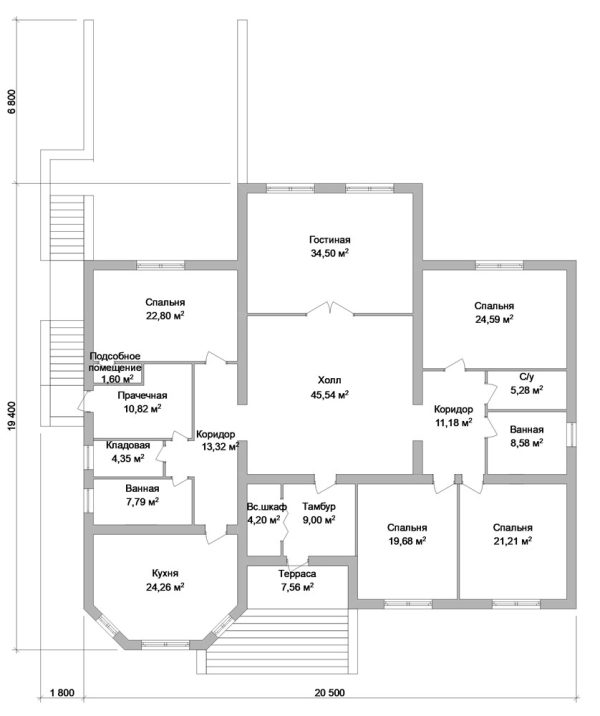 Общая площадь: 564,48 м2, одноэтажный, 4 спальни, материал строительства: кирпич, дополнения: терраса, подвал, цокольный этаж.
