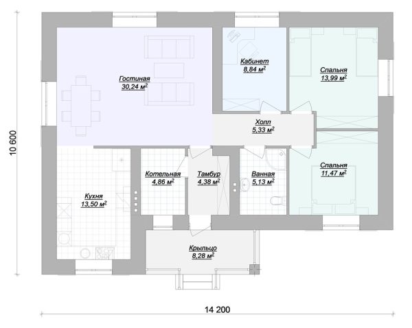 Общая площадь: 106,03 м2, одноэтажный, 2 спальни, материал строительства: блоки.