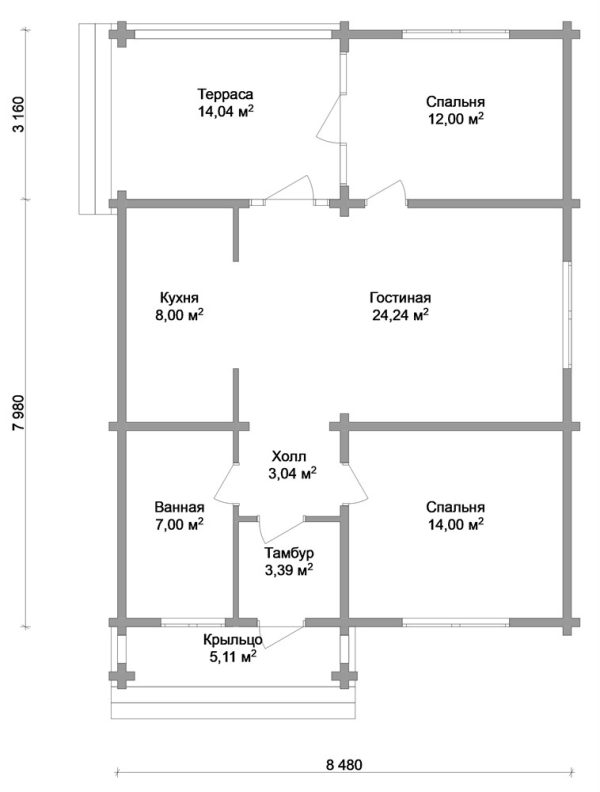 Общая площадь: 98,82 м2, одноэтажный, 2 спальни, материал строительства: дерево, дополнения: терраса.